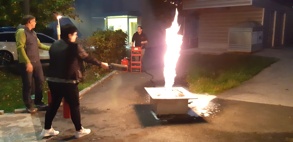 Im theoretischen Teil wurde das Brandschutzkonzept, Brandabschnitte, Fluchtwege etc. anschaulich erklärt. Im praktischen Teil wurden die unterschiedlichen Feuerlöscher bzw. die richtige Löschtechnik geübt.