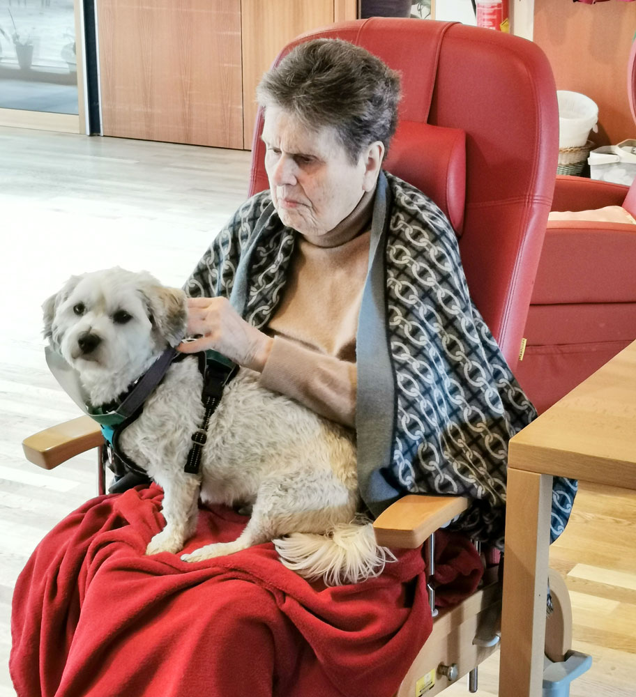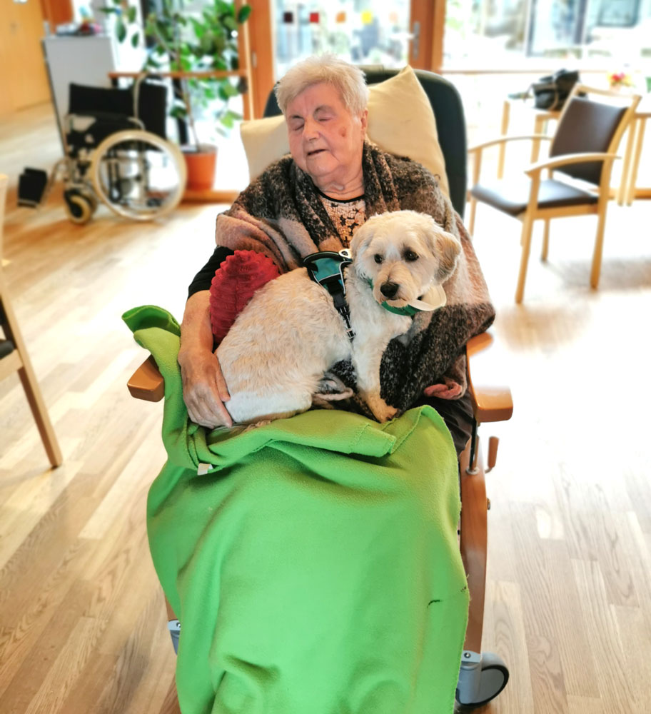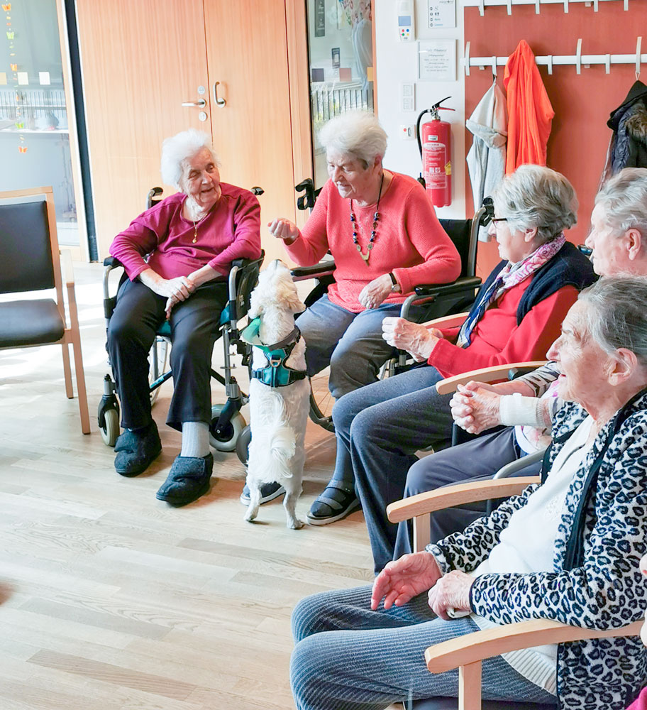 Dass „Chico“ ein ausgebildeter Therapie-Besuchshund ist, der uns künftig regelmäßig besuchen wird, war an den interessierten und auch beruhigenden Reaktionen unserer BewohnerInnen unschwer zu erkennen.